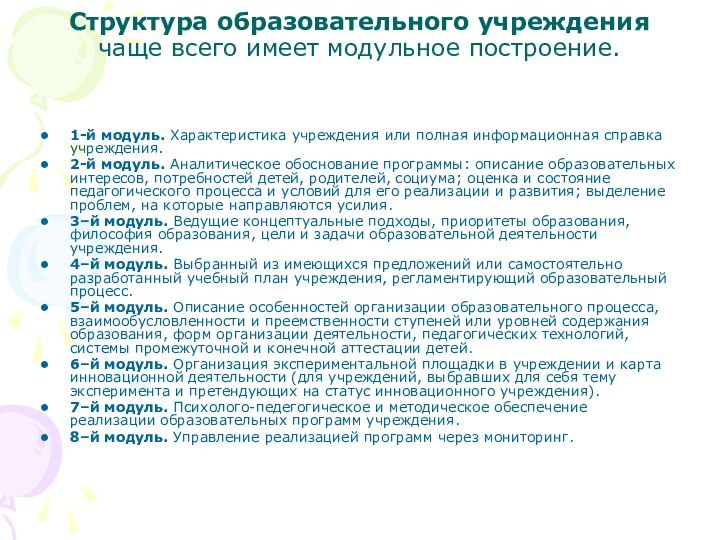 Структура образовательного учреждения чаще всего имеет модульное построение.