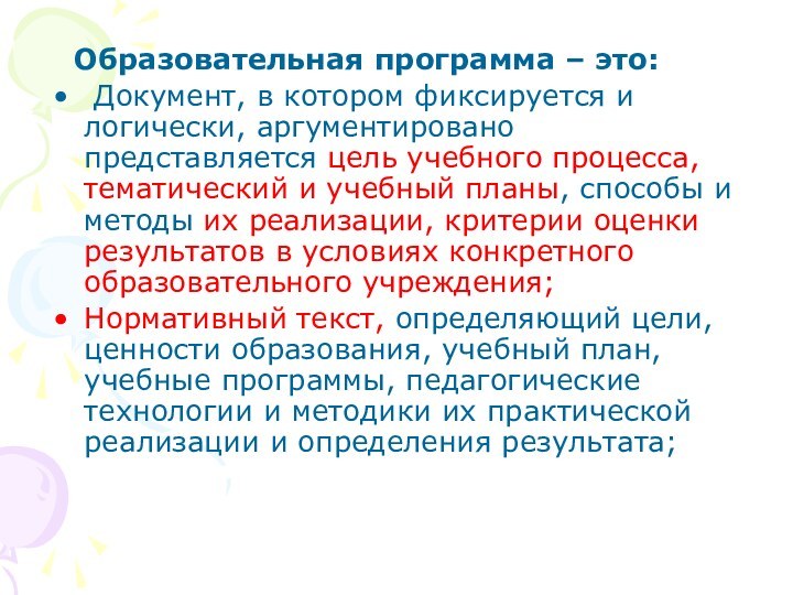 Нормативный текст, определяющий цели, ценности образования, учебный план, учебные программы, педагогические технологии и методики их практической реализации и определения результата;