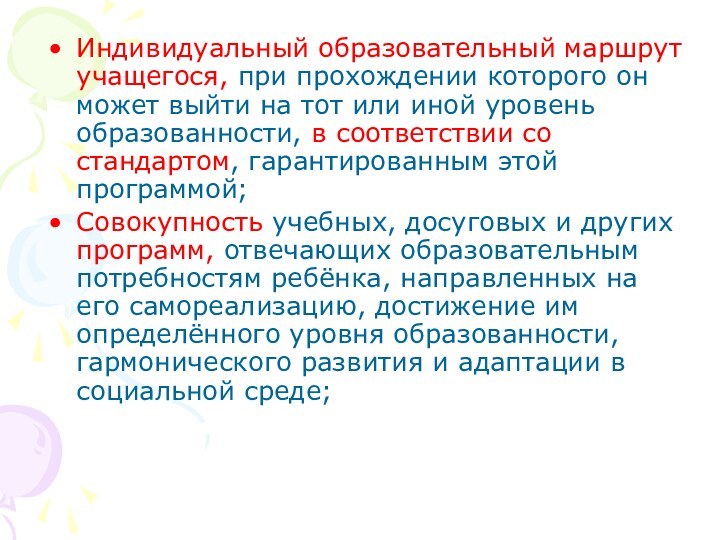 Совокупность учебных, досуговых и других программ, отвечающих образовательным потребностям ребёнка, направленных на его самореализацию, достижение им определённого уровня образованности, гармонического развития и адаптации в социальной среде;
