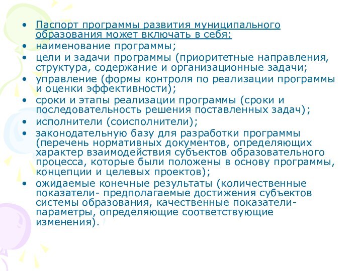 законодательную базу для разработки программы (перечень нормативных документов, определяющих характер взаимодействия субъектов образовательного процесса, которые были положены в основу программы, концепции и целевых проектов);