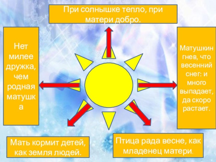весне, как младенец матери.Матушкин гнев, что весенний снег: и много выпадает, да скоро растает.