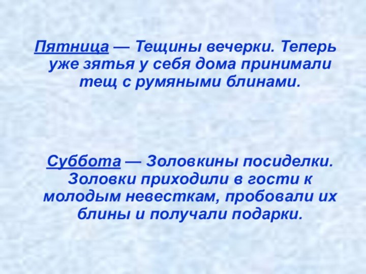 Суббота — Золовкины посиделки. Золовки приходили в гости к молодым невесткам, пробовали их блины и получали подарки.