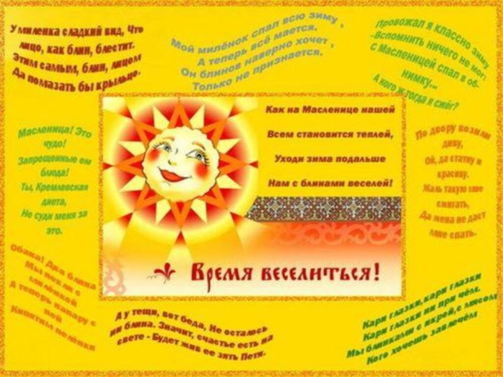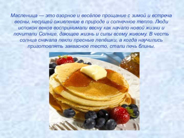 солнечное тепло. Люди испокон веков воспринимали весну как начало новой жизни и почитали Солнце, дающее жизнь и силы всему живому. В честь солнца сначала пекли пресные лепёшки, а когда научились приготовлять заквасное тесто, стали печь блины.