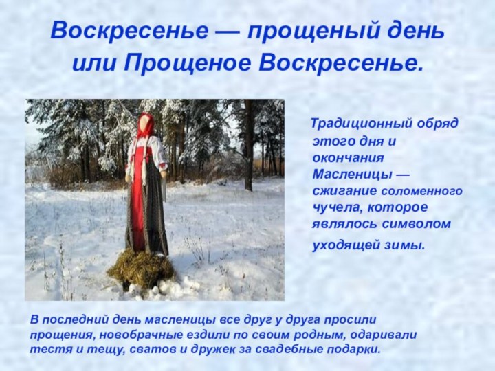 В последний день масленицы все друг у друга просили прощения, новобрачные ездили по своим родным, одаривали тестя и тещу, сватов и дружек за свадебные подарки.