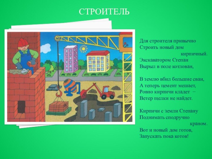 строительДля строителя привычноСтроить новый дом кирпичный.Экскаватором СтепанВырыл в поле котлован,В землю