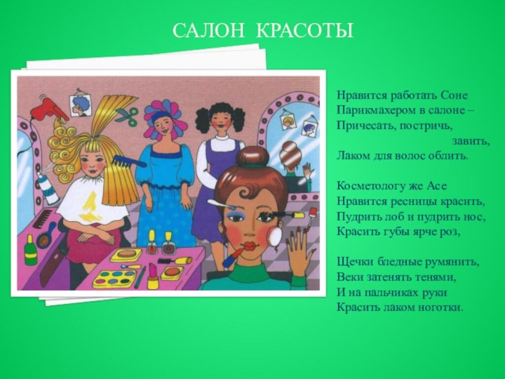 Салон красотыНравится работать СонеПарикмахером в салоне – Причесать, постричь, завить,Лаком для