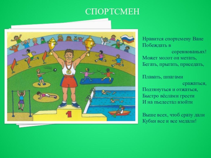 спортсменНравится спортсмену ВанеПобеждать в соревнованьях!Может молот он метать,Бегать, прыгать, приседать,Плавать, шпагамисражаться,Подтянуться
