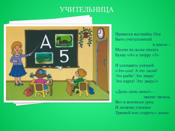 УЧИТЕЛЬНИЦАНравится всезнайке ОлеБыть учительницей в школе – Мелом на доске писатьБукву «А» и цифру «5».И указывать указкой:«Это сом! А это ласка!Это рыба! Это зверь!Это парта! Это дверь!»«Динь-динь-динь!» – звенит звонок,Вот и кончился урок.И должны ученикиТряпкой мел