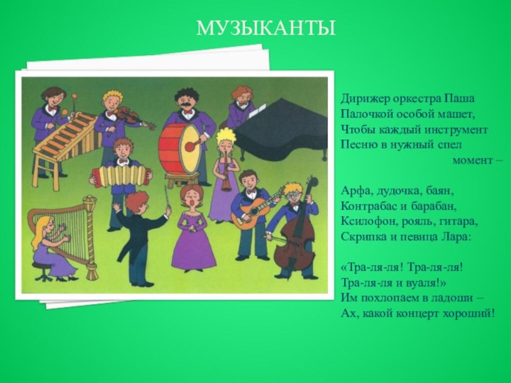 музыкантыДирижер оркестра ПашаПалочкой особой машет,Чтобы каждый инструментПесню в нужный спел момент
