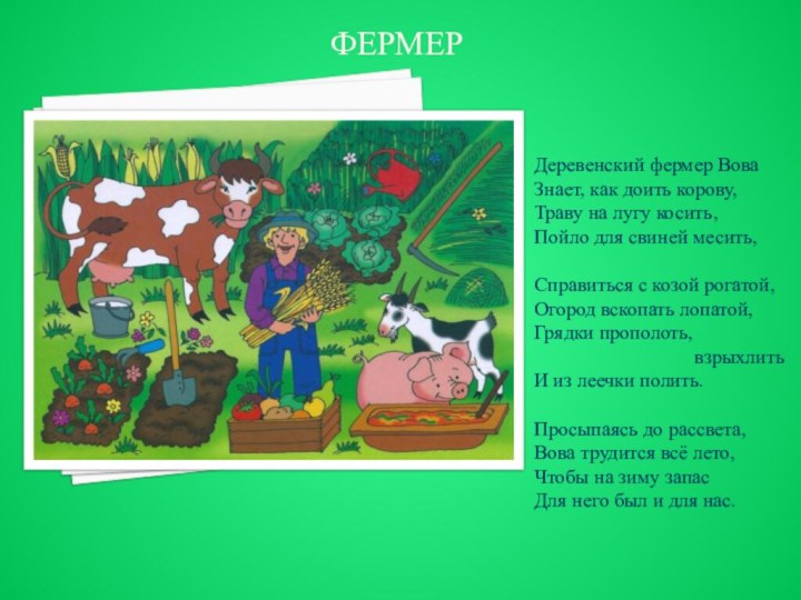 фермерДеревенский фермер ВоваЗнает, как доить корову,Траву на лугу косить,Пойло для свиней