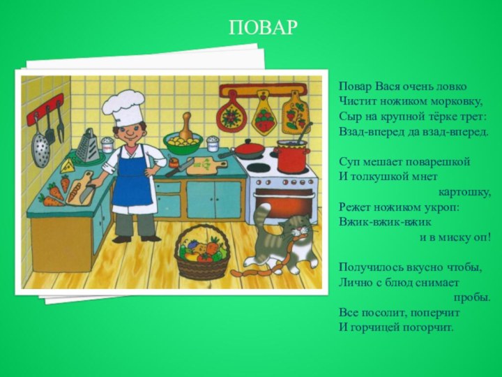 поварПовар Вася очень ловкоЧистит ножиком морковку,Сыр на крупной тёрке трет:Взад-вперед да