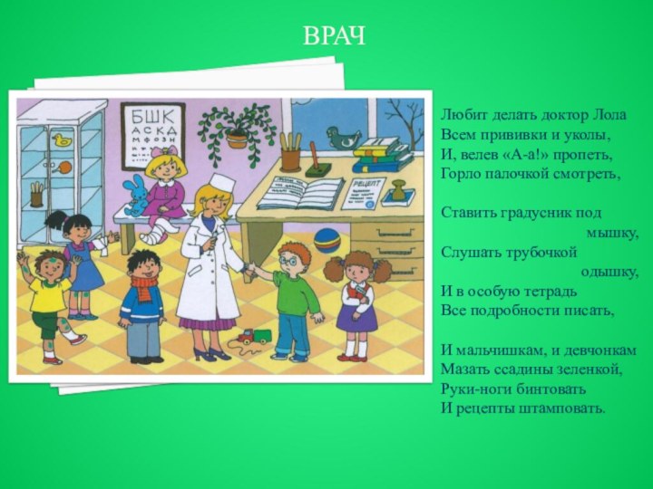 Все    профессии УЧИТЕЛЬНИЦАНравится всезнайке ОлеБыть учительницей в школе – Мелом на доске писатьБукву «А» художникНа холсте художник ПетяНарисует всё на свете.Опускает в краску кистьИ на холст строительДля строителя привычноСтроить новый дом кирпичный.Экскаватором СтепанВырыл в поле котлован,В землю вбил дрессировщицаУкротительница НадяНосит хлыст не драки ради.Только скажет: «Алле оп!»Тут же слон на уборщицаУ уборщицы КарлоттыОчень важная работа:Подмести, пропылесосить,Всё поднять, что на пол бросят,Вымыть окна, фермерДеревенский фермер ВоваЗнает, как доить корову,Траву на лугу косить,Пойло для свиней месить,Справиться врачЛюбит делать доктор ЛолаВсем прививки и уколы,И, велев «А-а!» пропеть,Горло палочкой смотреть,Ставить спортсменНравится спортсмену ВанеПобеждать в соревнованьях!Может молот он метать,Бегать, прыгать, приседать,Плавать, шпагамисражаться,Подтянуться и Салон красотыНравится работать СонеПарикмахером в салоне – Причесать, постричь, завить,Лаком для волос поварПовар Вася очень ловкоЧистит ножиком морковку,Сыр на крупной тёрке трет:Взад-вперед да взад-вперед.Суп столярУ Семена-столяраДело спорилось с утра:Он строгал, пилил, сверлил,Гвоздик молотком забил,А шуруп блестящий музыкантыДирижер оркестра ПашаПалочкой особой машет,Чтобы каждый инструментПесню в нужный спел момент –Арфа, Молодцы!!!
