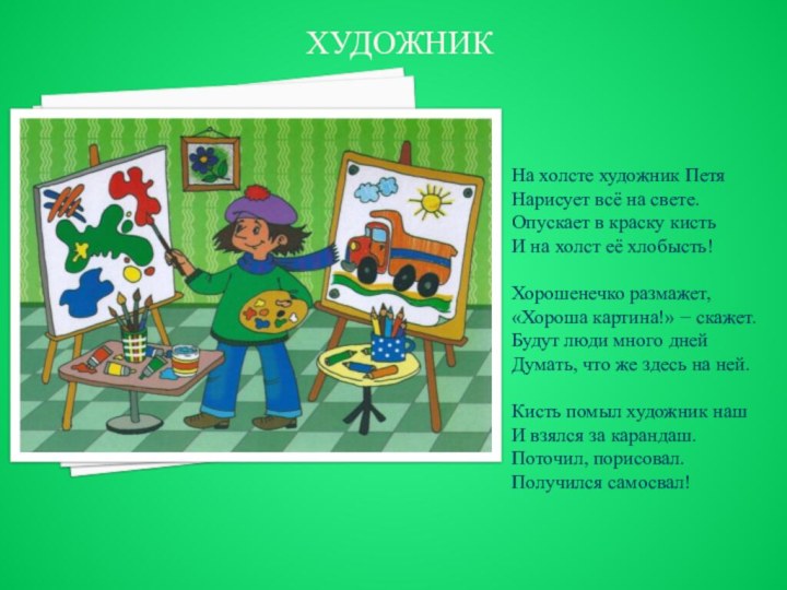 художникНа холсте художник ПетяНарисует всё на свете.Опускает в краску кистьИ на