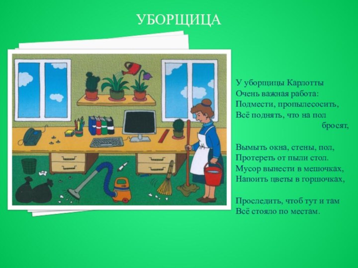 уборщицаУ уборщицы КарлоттыОчень важная работа:Подмести, пропылесосить,Всё поднять, что на пол бросят,Вымыть