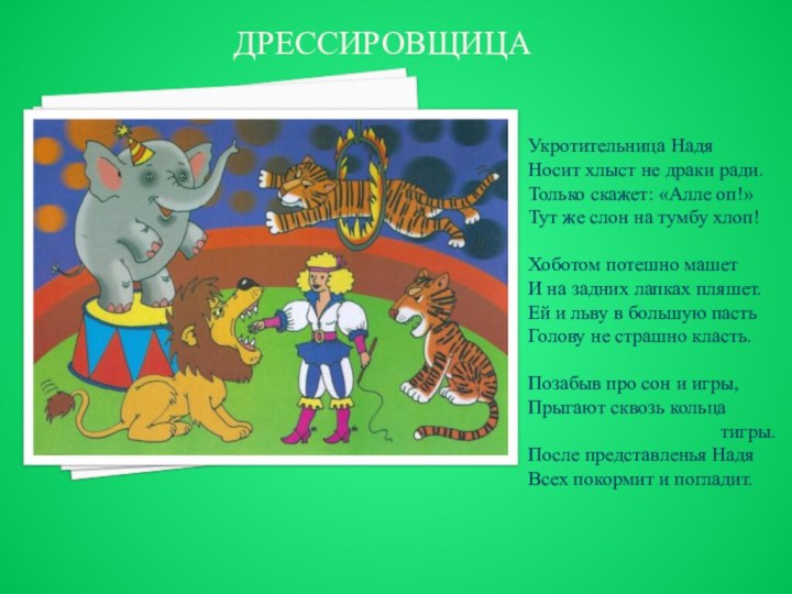 дрессировщицаУкротительница НадяНосит хлыст не драки ради.Только скажет: «Алле оп!»Тут же слон