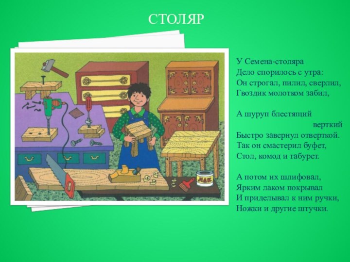 столярУ Семена-столяраДело спорилось с утра:Он строгал, пилил, сверлил,Гвоздик молотком забил,А шуруп