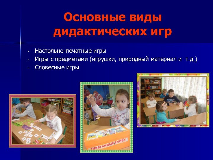 Основные виды дидактических игрНастольно-печатные игрыИгры с предметами (игрушки, природный материал и т.д.)Словесные игры