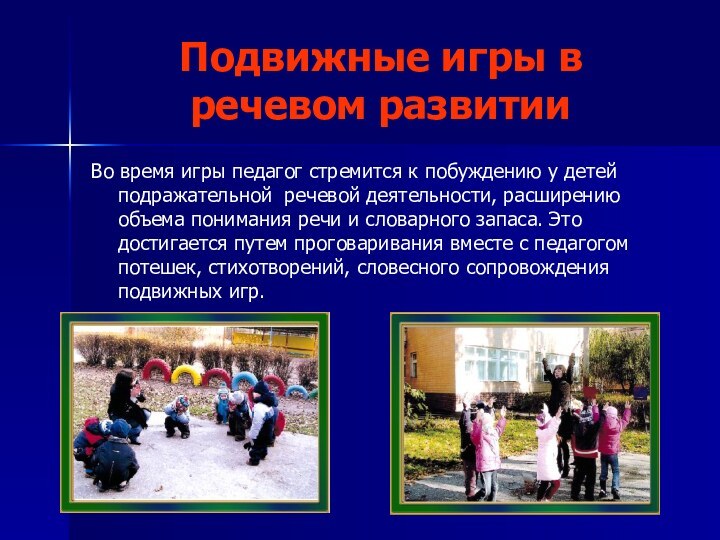 Подвижные игры в речевом развитииВо время игры педагог стремится к побуждению