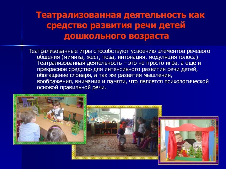 Театрализованные игры способствуют усвоению элементов речевого общения (мимика, жест, поза, интонация, модуляция голоса). Театрализованная деятельность – это не просто игра, а ещё и прекрасное средство для интенсивного развития речи детей, обогащение словаря, а так же развития мышления, воображения, внимания и памяти, что является психологической основой правильной речи.