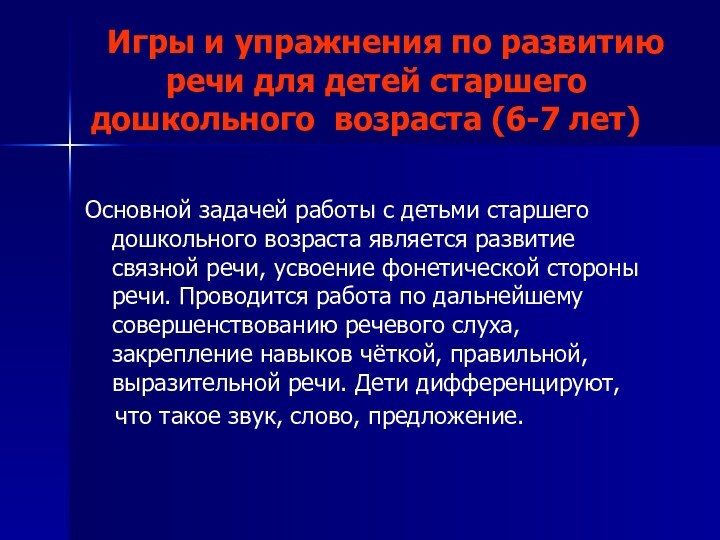 Основной задачей работы с детьми старшего дошкольного возраста является развитие связной речи, усвоение фонетической стороны речи. Проводится работа по дальнейшему совершенствованию речевого слуха, закрепление навыков чёткой, правильной, выразительной речи. Дети дифференцируют,