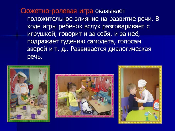 Слайд 19 Сюжетно-ролевая игра оказывает положительное влияние на развитие речи.