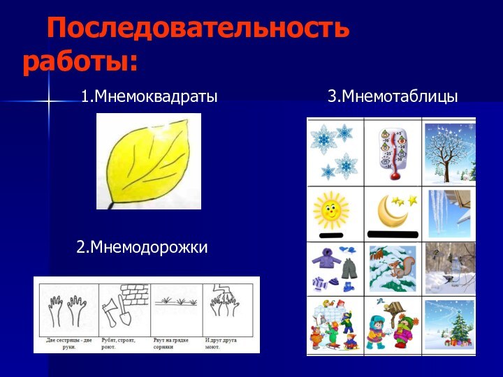 Последовательность работы:1.Мнемоквадраты2.Мнемодорожки3.Мнемотаблицы