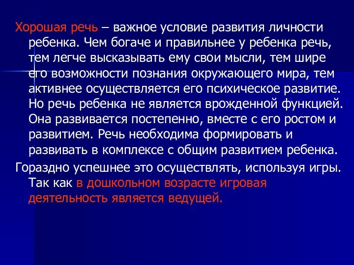 Хорошая речь – важное условие развития личности ребенка. Чем богаче и