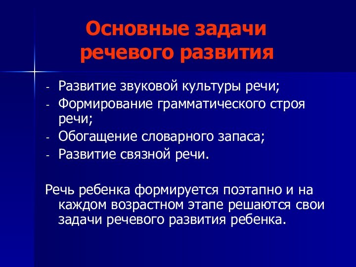 Речь ребенка формируется поэтапно и на каждом возрастном этапе решаются свои задачи речевого развития ребенка.
