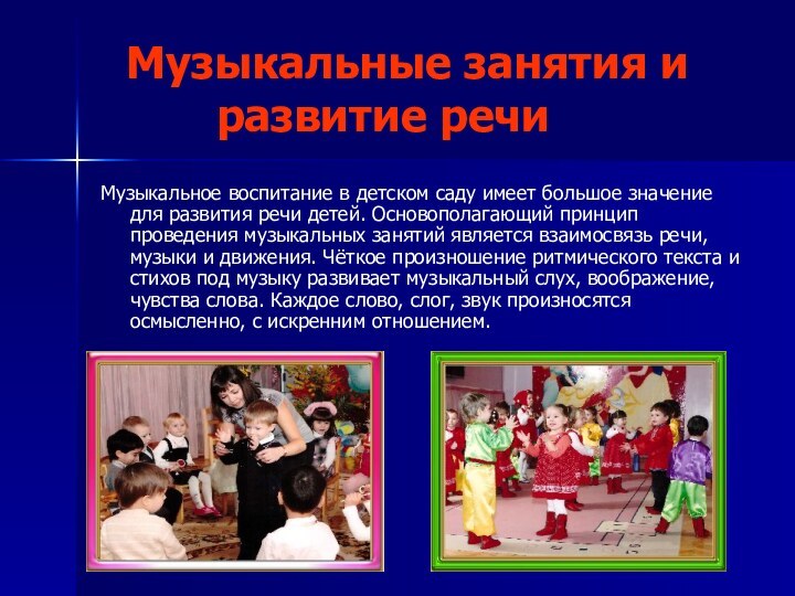 Музыкальные занятия и   развитие речиМузыкальное воспитание в детском