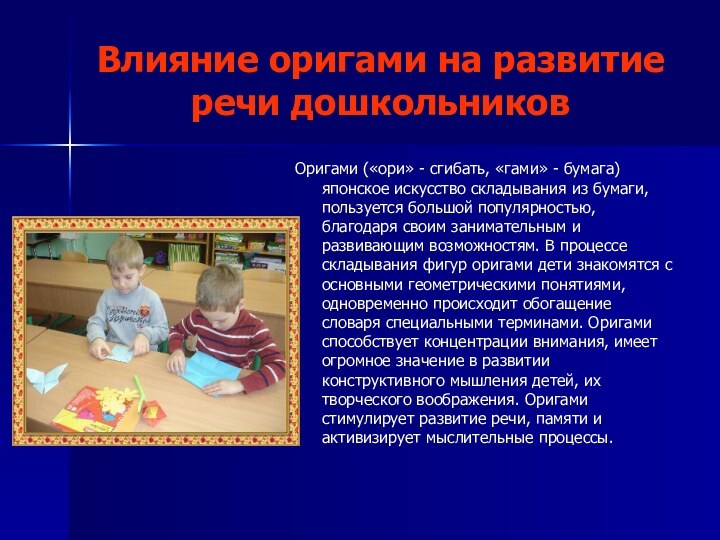 Влияние оригами на развитие    речи дошкольников Оригами («ори»