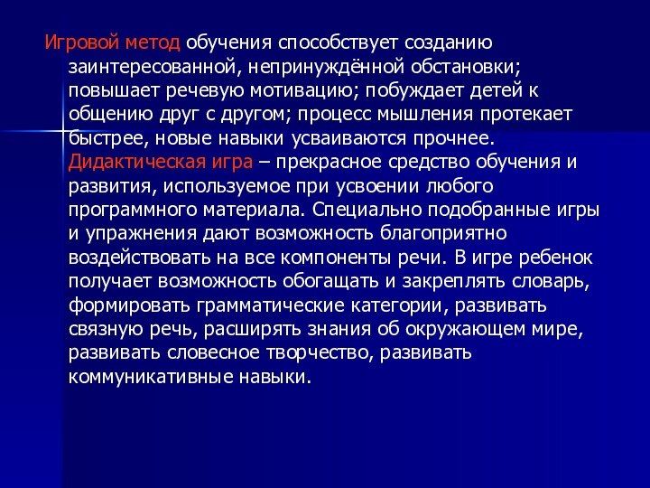 Игровой метод обучения способствует созданию заинтересованной, непринуждённой обстановки; повышает речевую мотивацию;