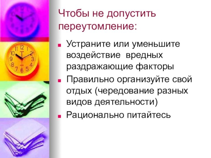 Чтобы не допустить переутомление:Устраните или уменьшите воздействие вредных раздражающие факторыПравильно организуйте