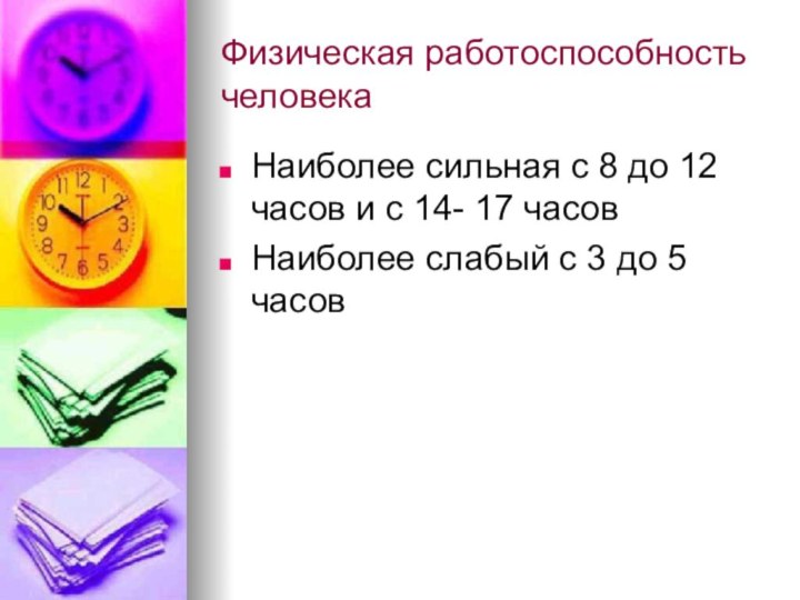 Физическая работоспособность человекаНаиболее сильная с 8 до 12 часов и с