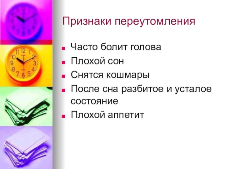 Признаки переутомленияЧасто болит головаПлохой сонСнятся кошмарыПосле сна разбитое и усталое состояниеПлохой аппетит