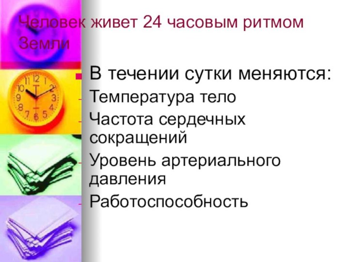 Человек живет 24 часовым ритмом ЗемлиВ течении сутки меняются:Температура телоЧастота сердечных сокращенийУровень артериального давленияРаботоспособность