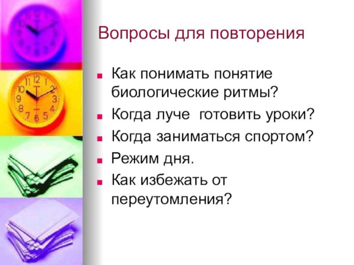 Вопросы для повторенияКак понимать понятие биологические ритмы?Когда луче готовить уроки?Когда заниматься