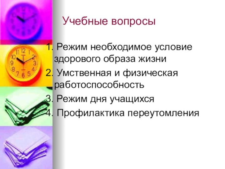 Учебные вопросы1. Режим необходимое условие здорового образа жизни2. Умственная и физическая работоспособность3. Режим дня учащихся4. Профилактика переутомления