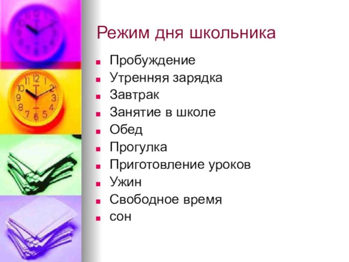 Режим дня школьникаПробуждениеУтренняя зарядкаЗавтрак Занятие в школеОбедПрогулкаПриготовление уроковУжинСвободное времясон