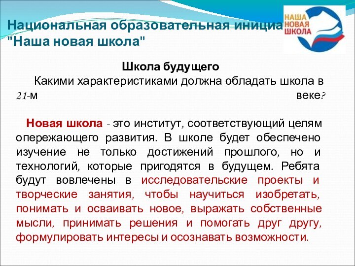 институт, соответствующий целям опережающего развития. В школе будет обеспечено изучение не только достижений прошлого, но и технологий, которые пригодятся в будущем. Ребята будут вовлечены в исследовательские проекты и творческие занятия, чтобы научиться изобретать, понимать и осваивать новое, выражать собственные мысли, принимать решения и помогать друг другу, формулировать интересы и осознавать возможности.