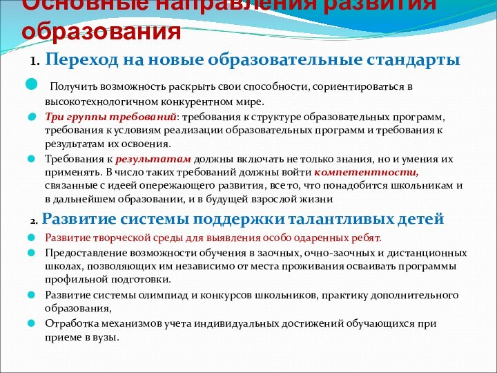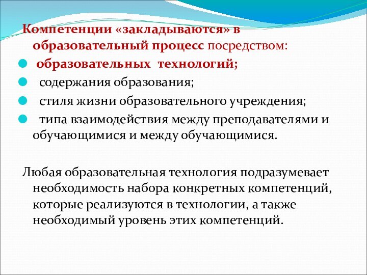 Требования к результатам должны включать не только знания, но и умения их применять. В число таких требований должны войти компетентности, связанные с идеей опережающего развития, все то, что понадобится школьникам и в дальнейшем образовании, и в будущей взрослой жизни