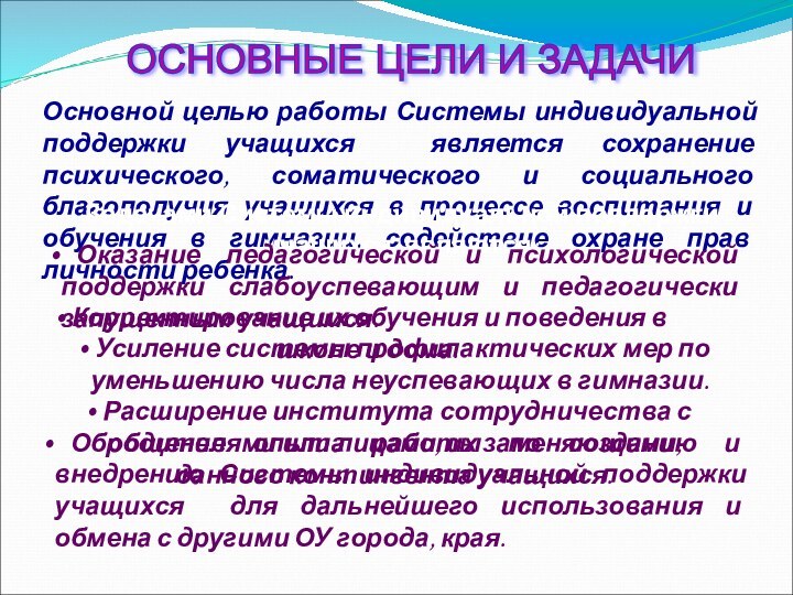 Основной целью работы Системы индивидуальной поддержки учащихся является сохранение психического, соматического и социального благополучия учащихся в процессе воспитания и обучения в гимназии, содействие охране прав личности ребенка.