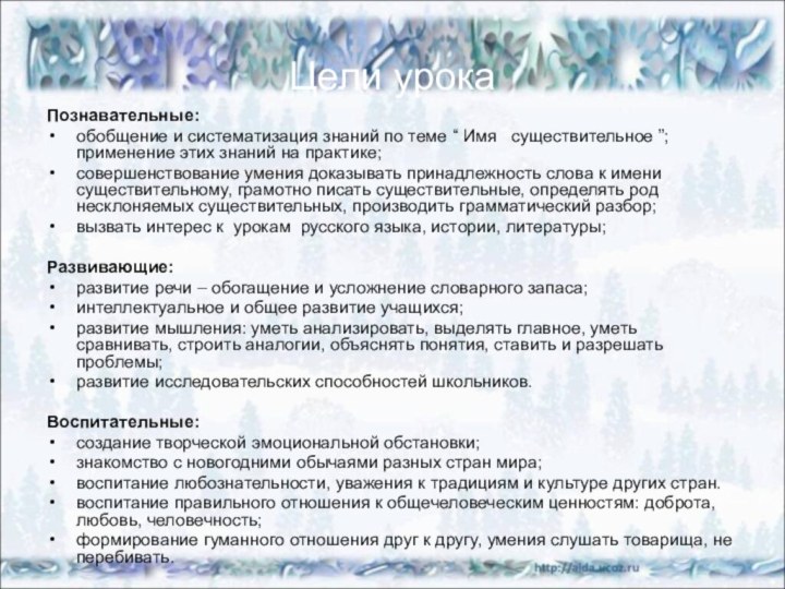 практике;совершенствование умения доказывать принадлежность слова к имени существительному, грамотно писать существительные, определять род несклоняемых существительных, производить грамматический разбор;
