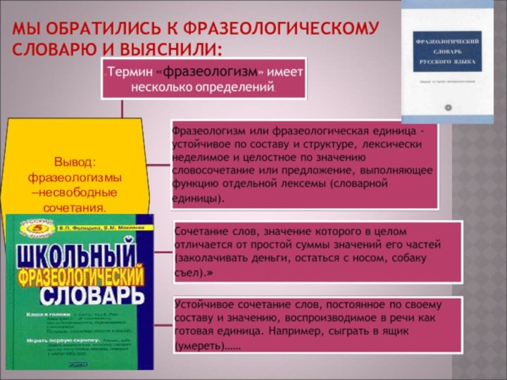 МЫ ОБРАТИЛИСЬ К ФРАЗЕОЛОГИЧЕСКОМУ СЛОВАРЮ И ВЫЯСНИЛИ: