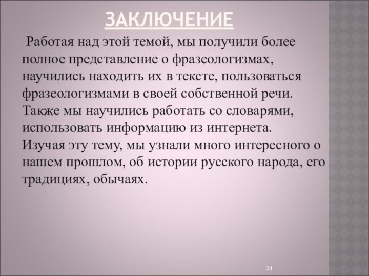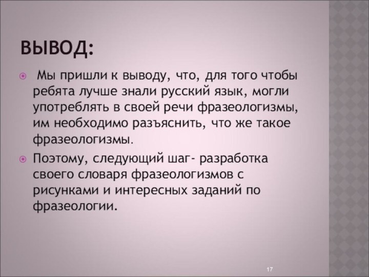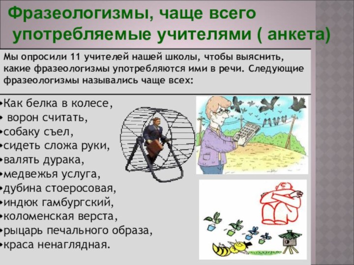 пользоваться фразеологизмами в своей собственной речи. Также мы научились работать со словарями, использовать информацию из интернета.