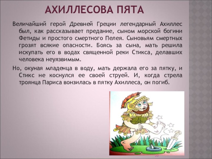 Но, окуная младенца в воду, мать держала его за пятку, и Стикс не коснулся ее своей струей. И, когда стрела троянца Париса вонзилась в пятку Ахиллеса, он погиб.