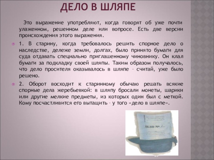 1. В старину, когда требовалось решить спорное дело о наследстве, дележе земли, долгах, было принято бумаги для суда отдавать специально приглашенному чиновнику. Он клал бумаги за подкладку своей шляпы. Таким образом получалось, что дело просителя оказывалось в шляпе – считай, уже было решено.