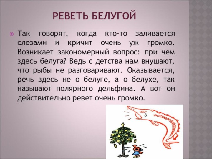 здесь белуга? Ведь с детства нам внушают, что рыбы не разговаривают. Оказывается, речь здесь не о белуге, а о белухе, так называют полярного дельфина. А вот он действительно ревет очень громко.