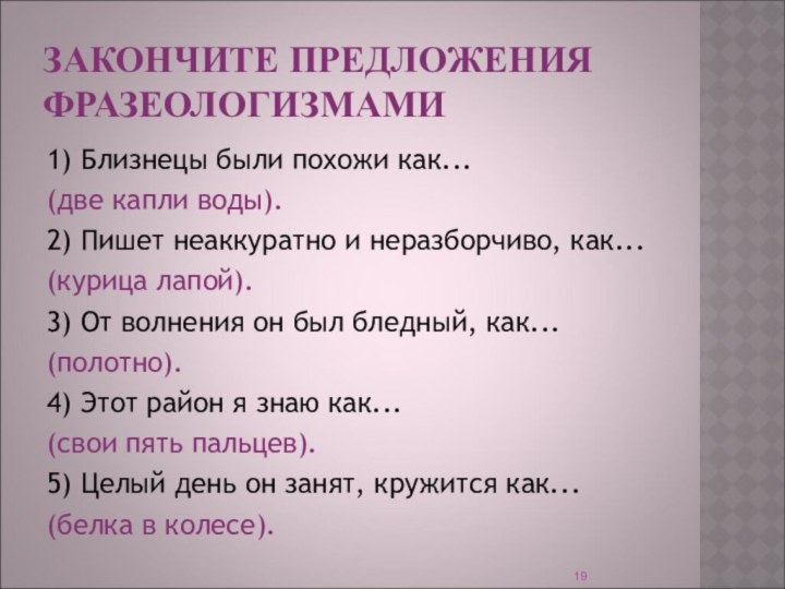 ЗАКОНЧИТЕ ПРЕДЛОЖЕНИЯ ФРАЗЕОЛОГИЗМАМИ