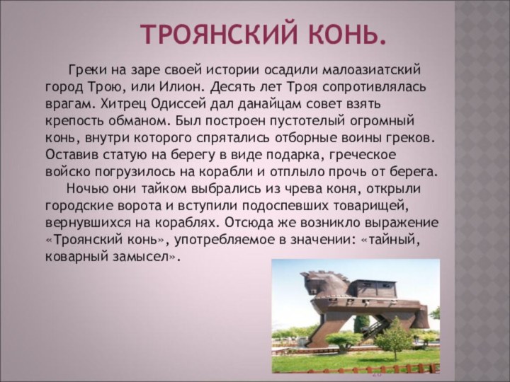 Десять лет Троя сопротивлялась врагам. Хитрец Одиссей дал данайцам совет взять крепость обманом. Был построен пустотелый огромный конь, внутри которого спрятались отборные воины греков. Оставив статую на берегу в виде подарка, греческое войско погрузилось на корабли и отплыло прочь от берега.