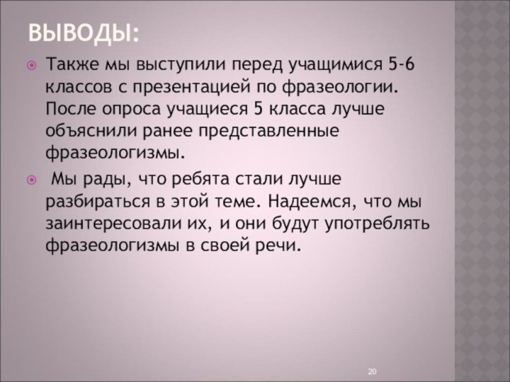 Мы рады, что ребята стали лучше разбираться в этой теме. Надеемся, что мы заинтересовали их, и они будут употреблять фразеологизмы в своей речи.